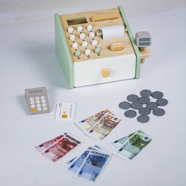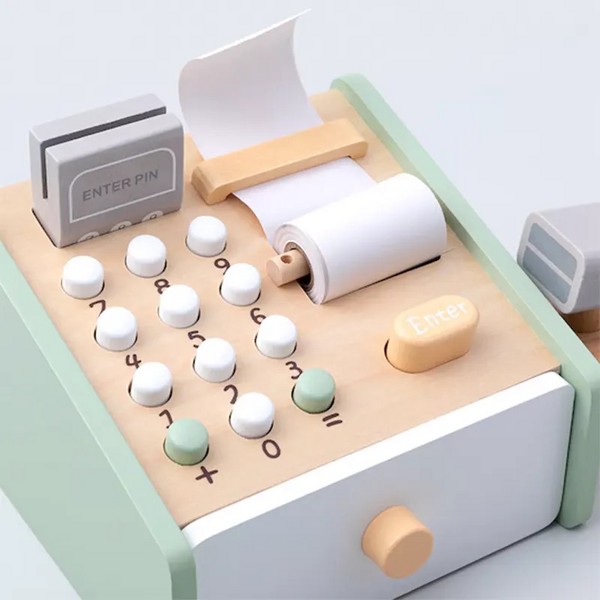 صندوق فروشگاهی چوبی پیکاردو مناسب برای گروه سنی ۳ سال به بالا دارای ۷ قطعه لوازم چوبی برای بازی و سرگرمی به عنوان اسباب بازی مشاغل کودکان است. این محصول از رنگ بر پایه آب و کاملا بی ضرر و دارای لبه های گرد و ایمن است.